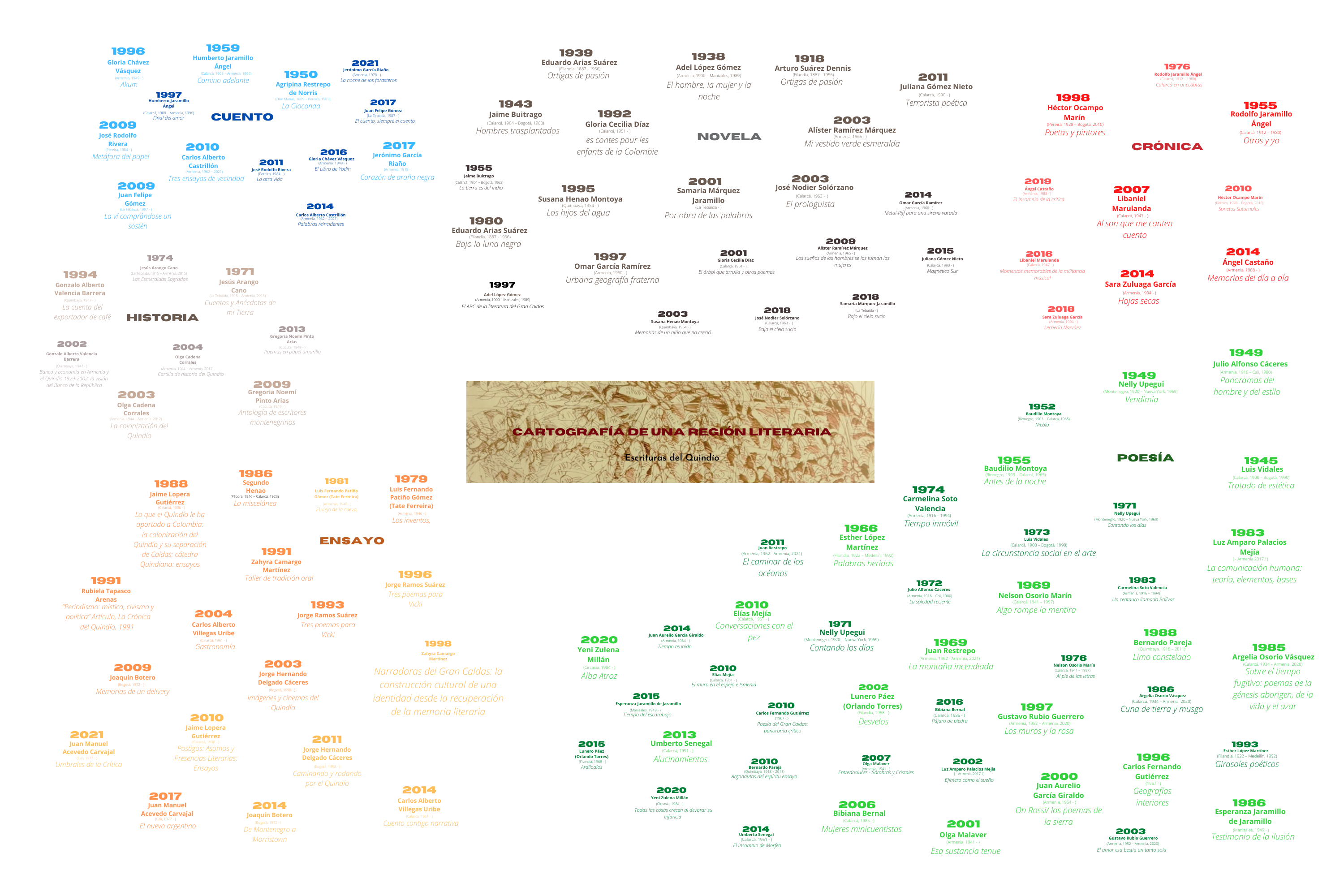 Para aquellos lectores que han tenido ocasión de recorrer el verde del departamento del Quindío, o han recibido noticia de que más allá de ese color existe un paisaje asombroso, en el que se destaca la belleza natural de su geografía íntima, los invitamos hoy a agregarle a esa postal una memoria viva, bastante diversa, tejida por la creatividad de mujeres y hombres empeñados en construir, con la palabra y sus resonancias más arcanas, una cartografía literaria. Invitamos a sumarle a la geografía íntima del Quindío, una geografía humana, donde historiadores, ensayistas, poetas, cuentistas, dramaturgas, periodistas y gestores culturales, imprimen a su región un sello particular con sus historias de vida.