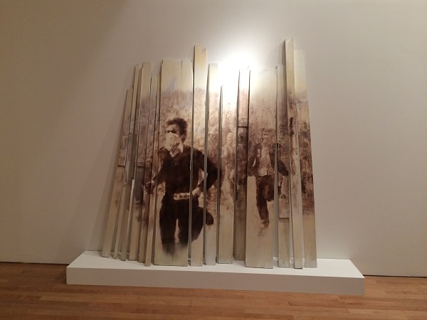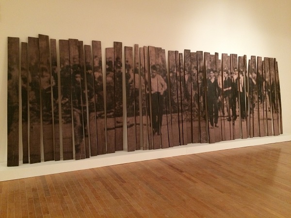 … restablece el momento inaugural de una representación que ha sido sometida a una extensa cadena de mediaciones: desde aquel instante de la revuelta popular que quedó atrapado en la toma fotográfica documental, pasando por la reproducción del diario de la que Sacco tomó la imagen, hasta la presentación difusa y fragmentada que imponen las vallas y la trama abierta del registro fotográfico. Cada uno de estos pasajes actualiza la fuerza del tema. La revelación heliográfica se apodera de todos estos sucesivos poderes de la imagen y los reinscribe en un soporte nuevo con el propósito principal de plantear un interrogante. En esta marcha colectiva Sacco no pretende registrar el instante preciso que atrapó la toma fotográfica, sino la latencia activa de los tiempos, la fuerza propulsora desde la que el pasado puede interrogar el presente. Y el sentido irrevocable del reclamo que activa a las multitudes que avanzan por las calles.